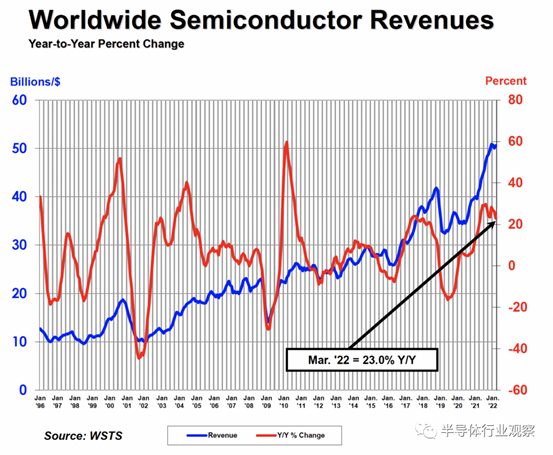 半導(dǎo)體行業(yè)協(xié)會(huì) (SIA) 統(tǒng)計(jì)數(shù)據(jù)顯示,2022年第一季度全球半導(dǎo)體銷售額達(dá)到 1517億美元,較去年同期增長(zhǎng)23%。但比2021年第四季度低0.5% 。2022年3月全球銷售額為506億美元,環(huán)比增長(zhǎng)1.1%。